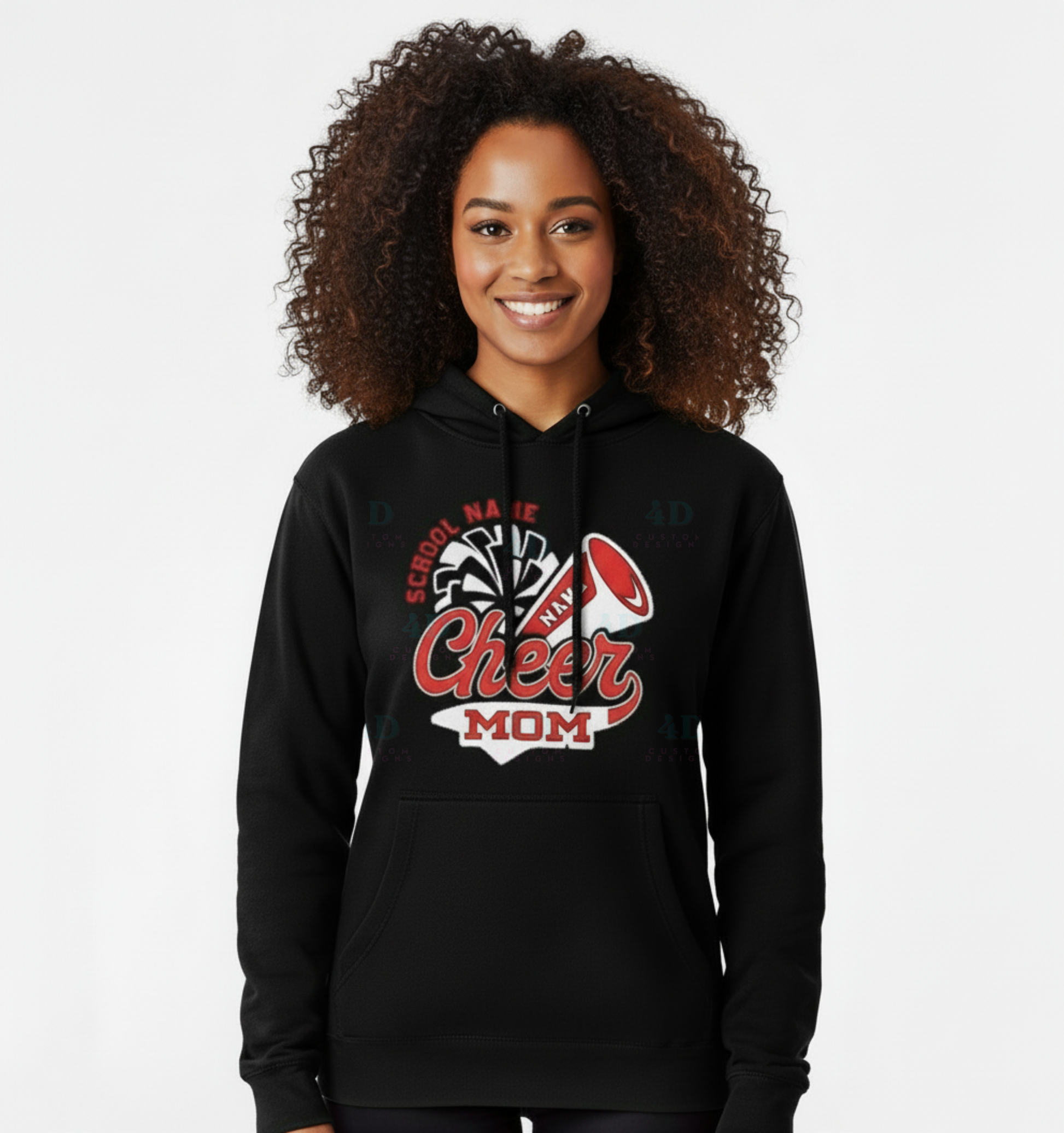 Show your school spirit in style with our personalized Cheer Mom design—perfect for game days, pep rallies, and every moment in between! Featuring bold lettering, a dynamic pom-pom graphic, and a customizable megaphone with your cheerleader’s name and school, this design is a must-have for proud moms who cheer the loudest.